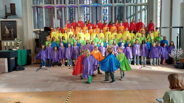 Kinderchor und Spatzenchor Kaufungen waren beim Landeskinderchortag der Ev. Kirche von Kurhessen-Waldeck am 20.09.2025 in der Martinskirche Kassel. Einen Tag lang wurden die vorbereiteten Lieder zusammen mit 200 weiteren Kindern aus anderen Kinderchören geübt. Zum Schluss gab es ein großartiges Konzert mit der Uraufführung des Musicals "Die Schöpfung singt" von Peter Schindler (Text: Babette Dieterich). Das einstündige Stück wurde eigens für diesen Anlass geschrieben. Die Leitung hatten KMD Anne Langenbach, Fachbereichsleiterin Kinder- und Jugendkantorat, und Juliane Baumann-Kremzow, Profilkantorin in diesem Bereich. Weitere Profilkantor:innen und ein Instrumentalensemble mit dem Komponisten am Klavier waren ebenfalls beteiligt.