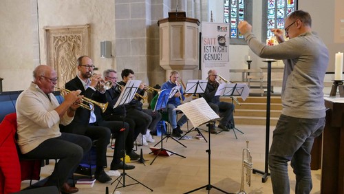 Der Posaunenchor Oberkaufungen unter der Leitung von Carsten Noll spielt in dem Gottesdienst in der Zehntscheune weihnachtliche Musik. Liturgie und Predigt: Pfarrer Dr. Martin Abraham